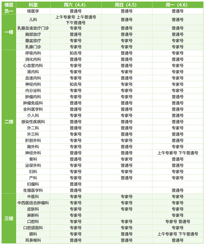 为保障清明假期诊疗需求,4月4日-6日,我院门诊、急诊照常运行,医疗服务“不停歇”,为您的健康保驾护航。各科室具体出诊时间、专家排班及注意事项均已详细列出,方便您随时查阅,以便高效、顺畅就诊。